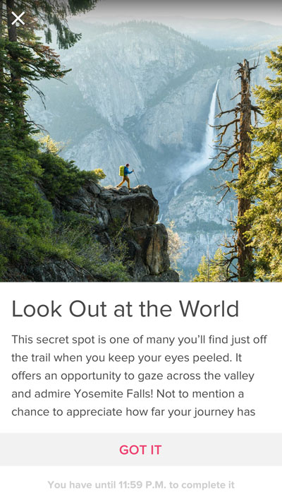 Utilisez les pas effectués dans la vraie vie pour atteindre les destinations du jour et progresser le long d'incroyables pistes virtuelles comme la boucle de la vallée du Yosemite.